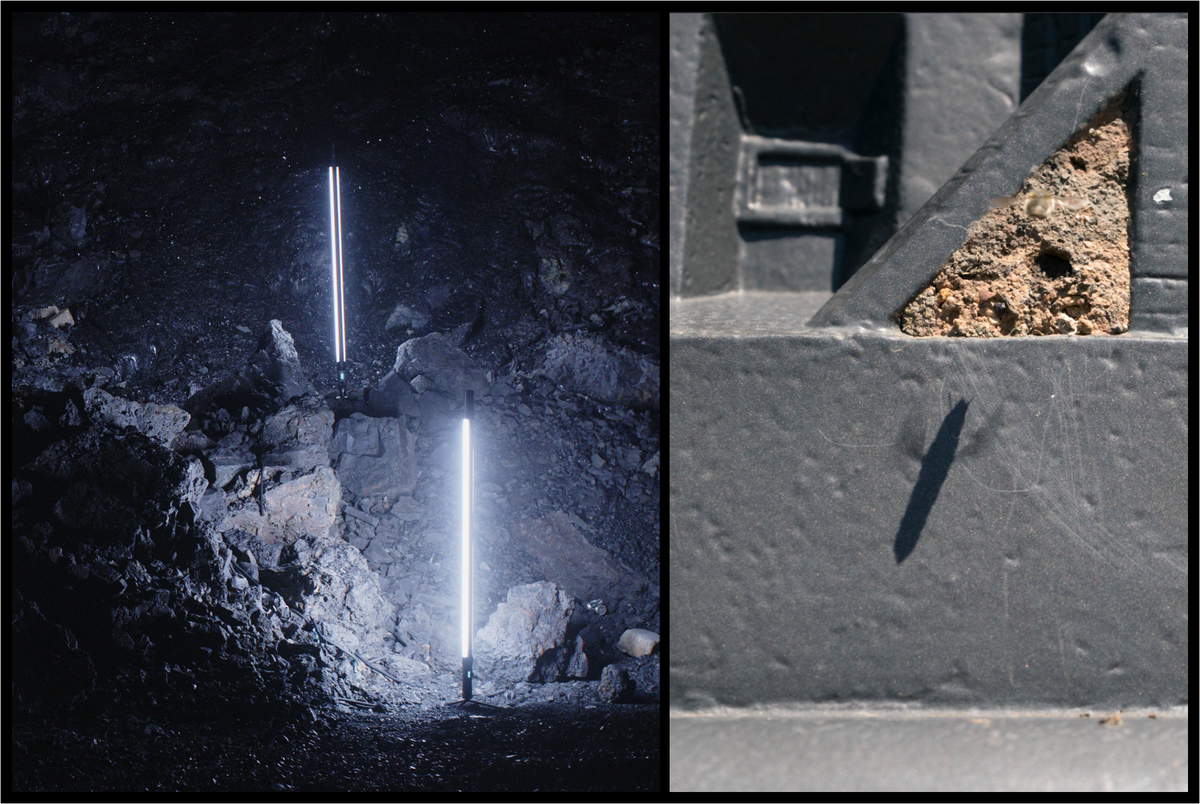 Viktor Brim leuchtet Halden aus und scannt Schlackesteine. Über diese technischen Prozesse des Abtastens kommt er der vom Menschen geschaffenen und abgelagerten Materie näher. Ausgangspunkt für seine Untersuchungen und zugleich Titel für seine Arbeit ist Geontopower. Die hieran geknüpfte Kritik an Machtverhältnissen führt auch zu der Frage: Wer entscheidet, dass eine Gegend zur Bergbaulandschaft wird, wer entscheidet, dass aus Gestein Erz und Schlacke entstehen und wem gehört das alles? Am Hettstedter Maschinendenkmal beobachtete Felicitas Fäßler eine Mörtelbiene beim Bau ihres Nestes. Über mehrere Tage hat diese in einem Winkel des Reliefbildes Sandkörnchen und Lehmpartikel zusammengefügt, ein kleines Loch verschafft ihr den Zugang in das Nestinnere. Inspiriert vom Schaffen des kleinen Tieres, bringt Felicitas Fäßler die Bautätigkeit des Insekts mit dem Schaffen der Bergleute in Verbindung.