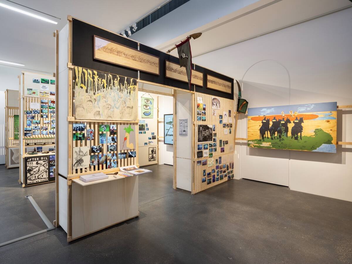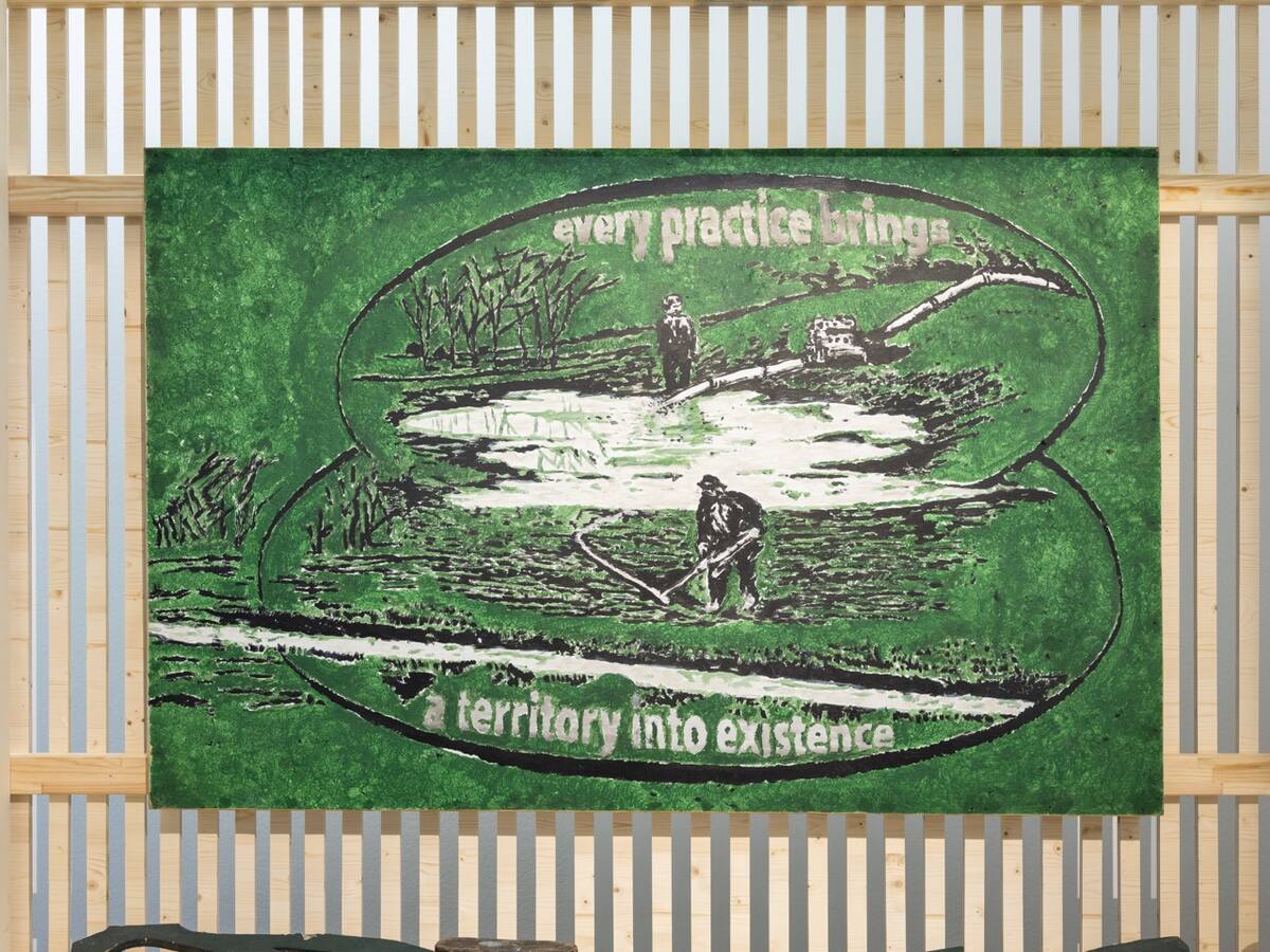The presentation of images of agriculture collected by the Hungarian artist Tamás Kaszás (born 1976) can be divided into two categories: historical images reworked (from art history to propaganda to product packaging) and new paintings and collages. The latter can further be divided into critical images, which expose the fundamentally destructive ways in which we produce our food (monoculture, overuse of soil and toxins...) and parallel the representations of these harmful extraction technologies with social problems of oppression and inequality. And good examples: futuristic images of sustainable ways of working the land that revive ancient ways of respectful agriculture. All the images oscillate between idealised depictions of heroic peasants, feeding the world through their work, and images of sorrow, portraying peasants as human forms of pure suffering. The installation can be seen as an educational vehicle for a new beginning, telling the story of agriculture to a small group of future apocalyptic survivors as a utopian scenario.