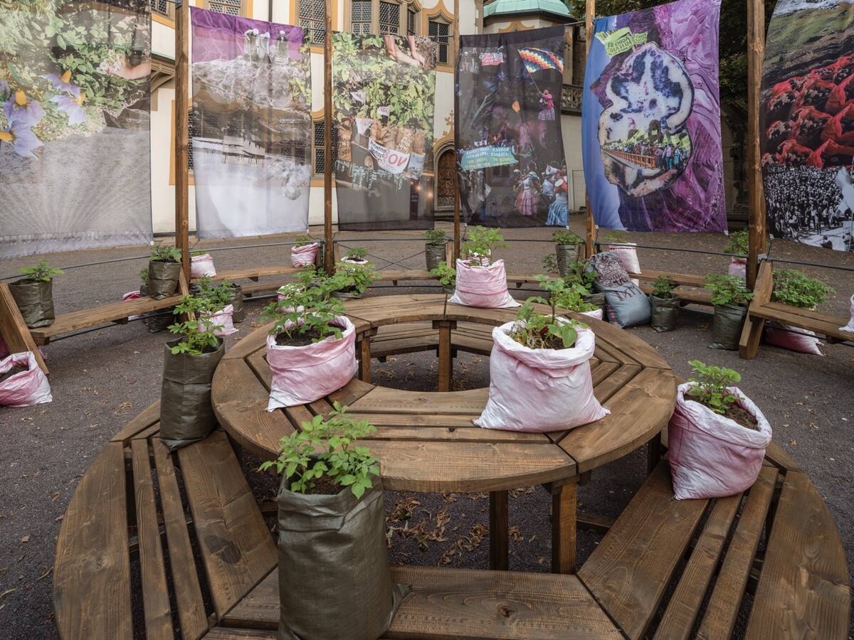 The ongoing struggle against oppression and for shared prosperity is embodied in a Wealth Acknowledgement for Halle, developed in a workshop with Vishnu Vardhani Rajan, and in the shared meal featuring an Andean potato variety cultivated in the Moritzburg courtyard by Åsa Sonjasdotter and Daniela Zambrano Almidón.