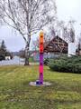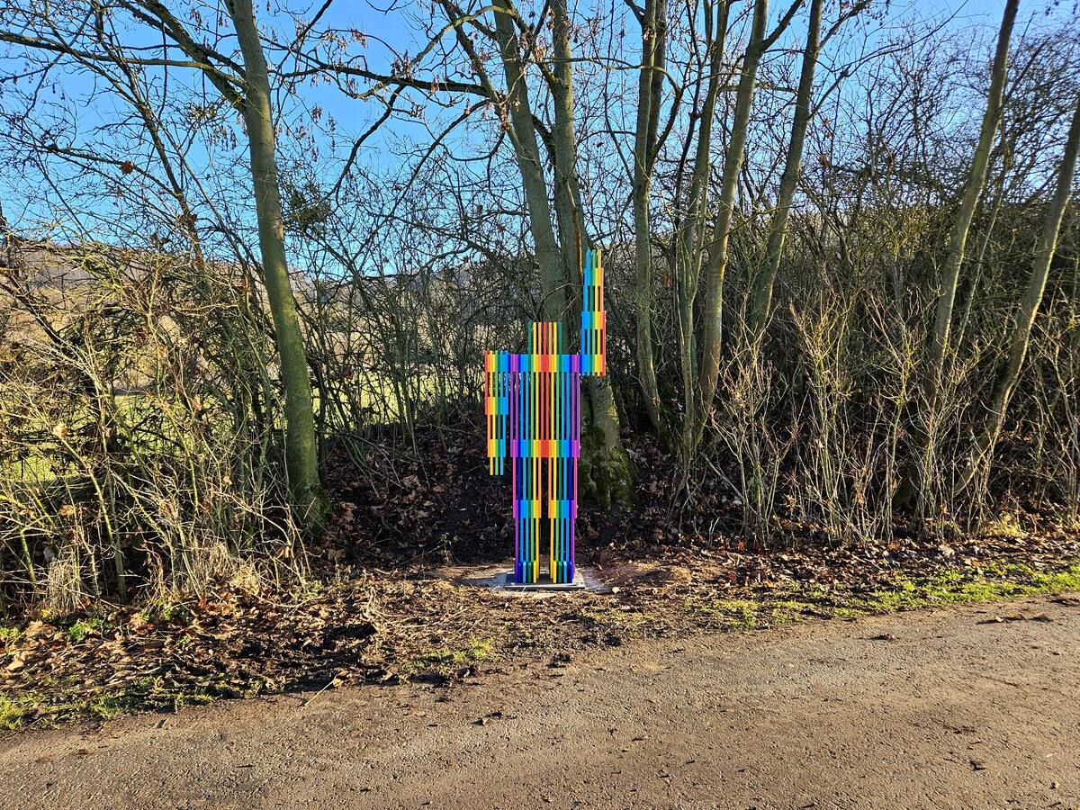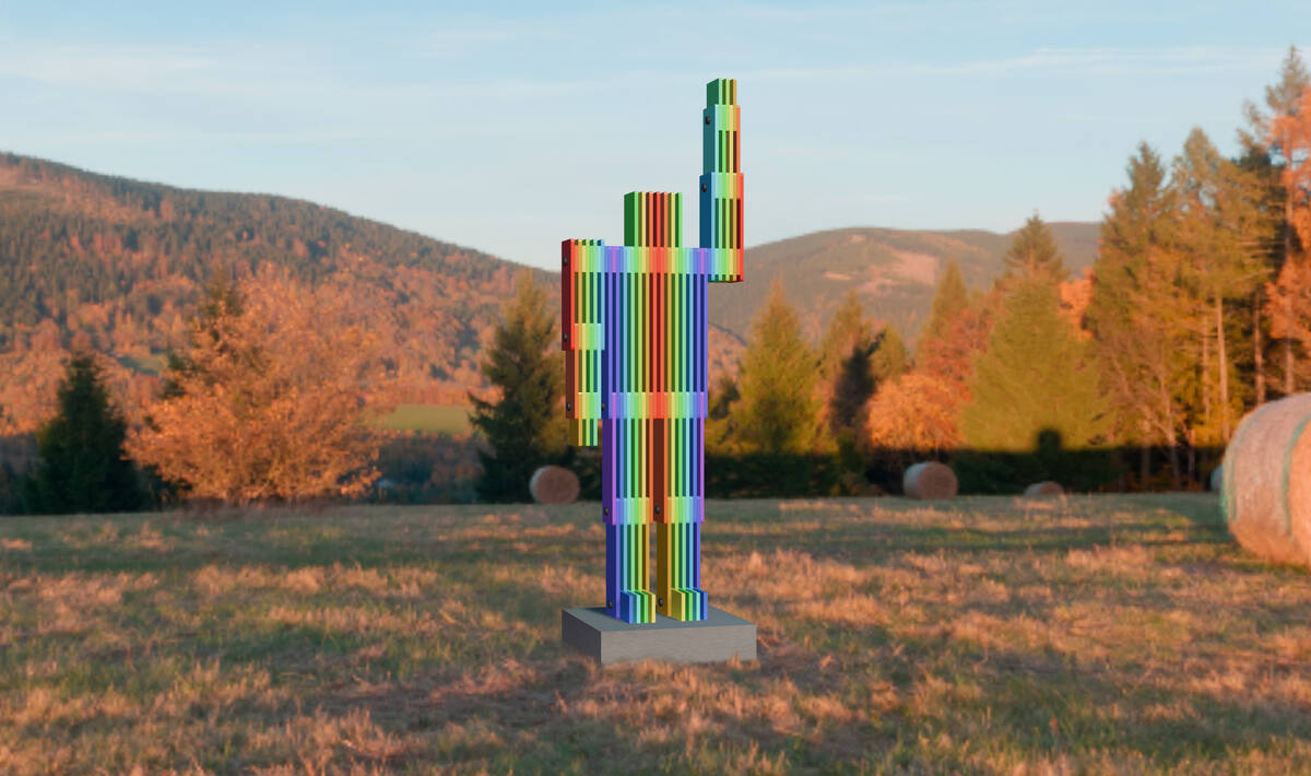Robota 500 by Stine Albrecht and Hermann Beneke is a 2.70-meter-tall metal sculpture composed of vertically layered aluminum plates forming a humanoid figure. Painted in rainbow colors, the sculpture stands as both a symbol of the uprising of an instrumentalized class and a prompt to reflect on the technologization and automation of our natural ways of life. Its raised arm may be seen as a call to struggle—or as a gesture pointing toward a new era.