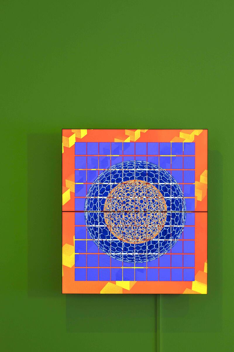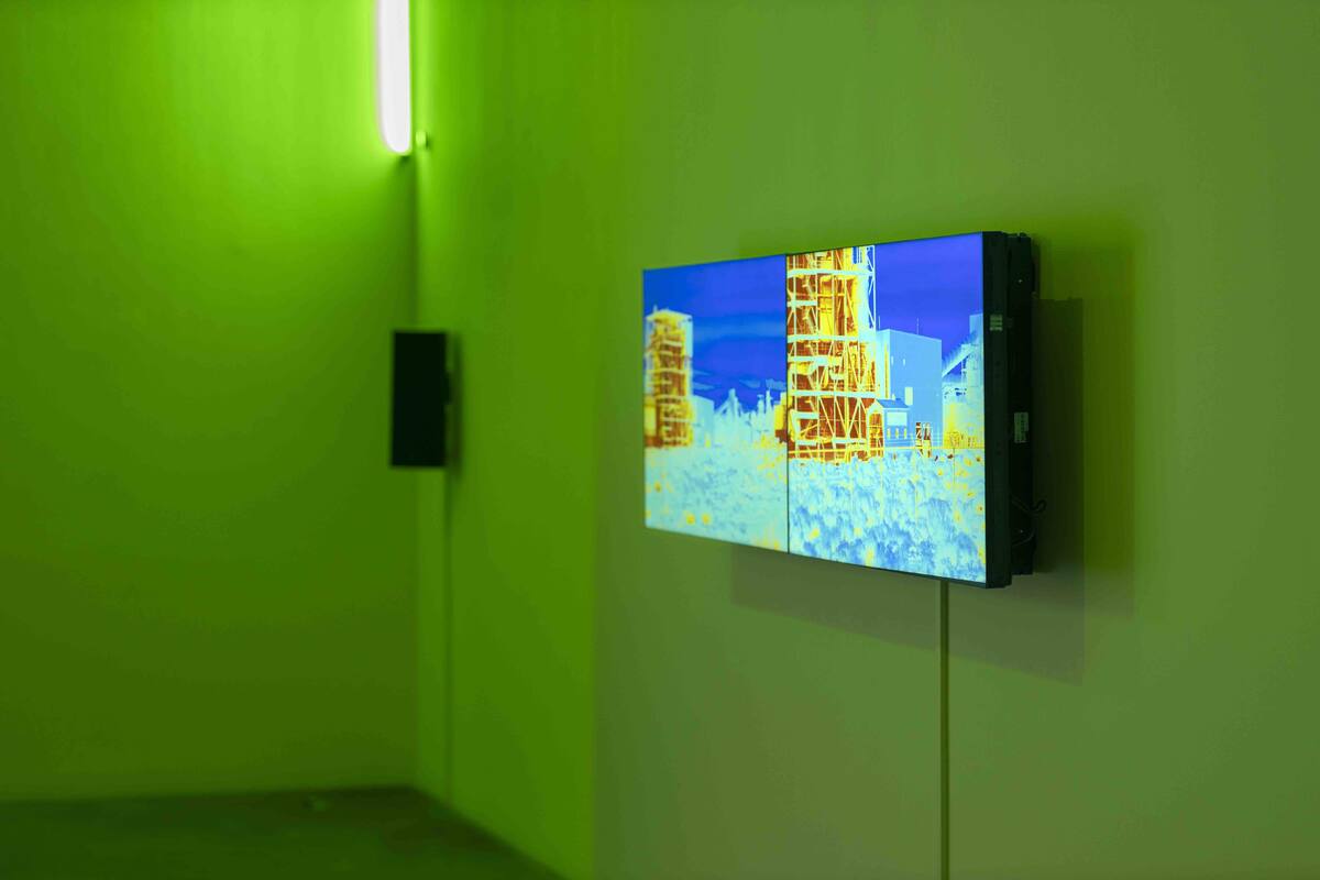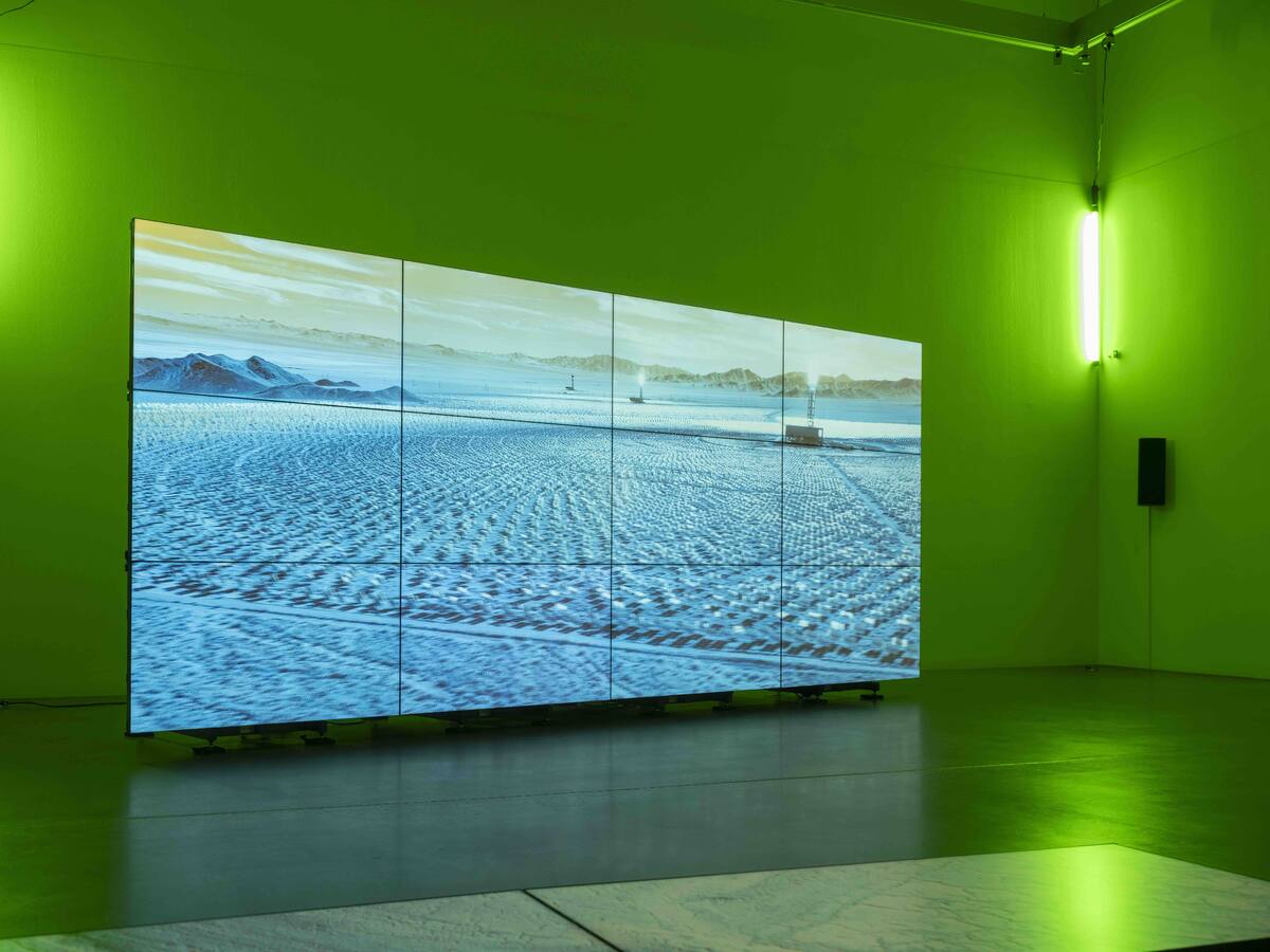 In Saline Operations, cologne-based artist and filmmaker Viktor Brim (born 1987 in Tashkent, Uzbekistan) turns his attention to the Mojave Desert in the southwestern United States. Once ancient salt lakes, now desiccated, their geological strata record the climate of millions of years. Today, these sites are used to harvest solar salt, an important storage medium in photovoltaics. The rugged terrain evokes an extraterrestrial landscape. Brim immerses it in data-driven colour using an NDVI filter, rendering concealed tectonic layers, vegetation zones and human-made infrastructure starkly visible in what Brim describes as an “operational view” of the landscape. Presented across several screens arranged in the exhibition space, which is structured like a map using geodesic grids, and accompanied by an AI-generated four-channel soundtrack, *Saline Operations foregrounds the complexity of a geography that’s in constant flux, shaped by both natural forces and extractive human activity.