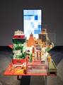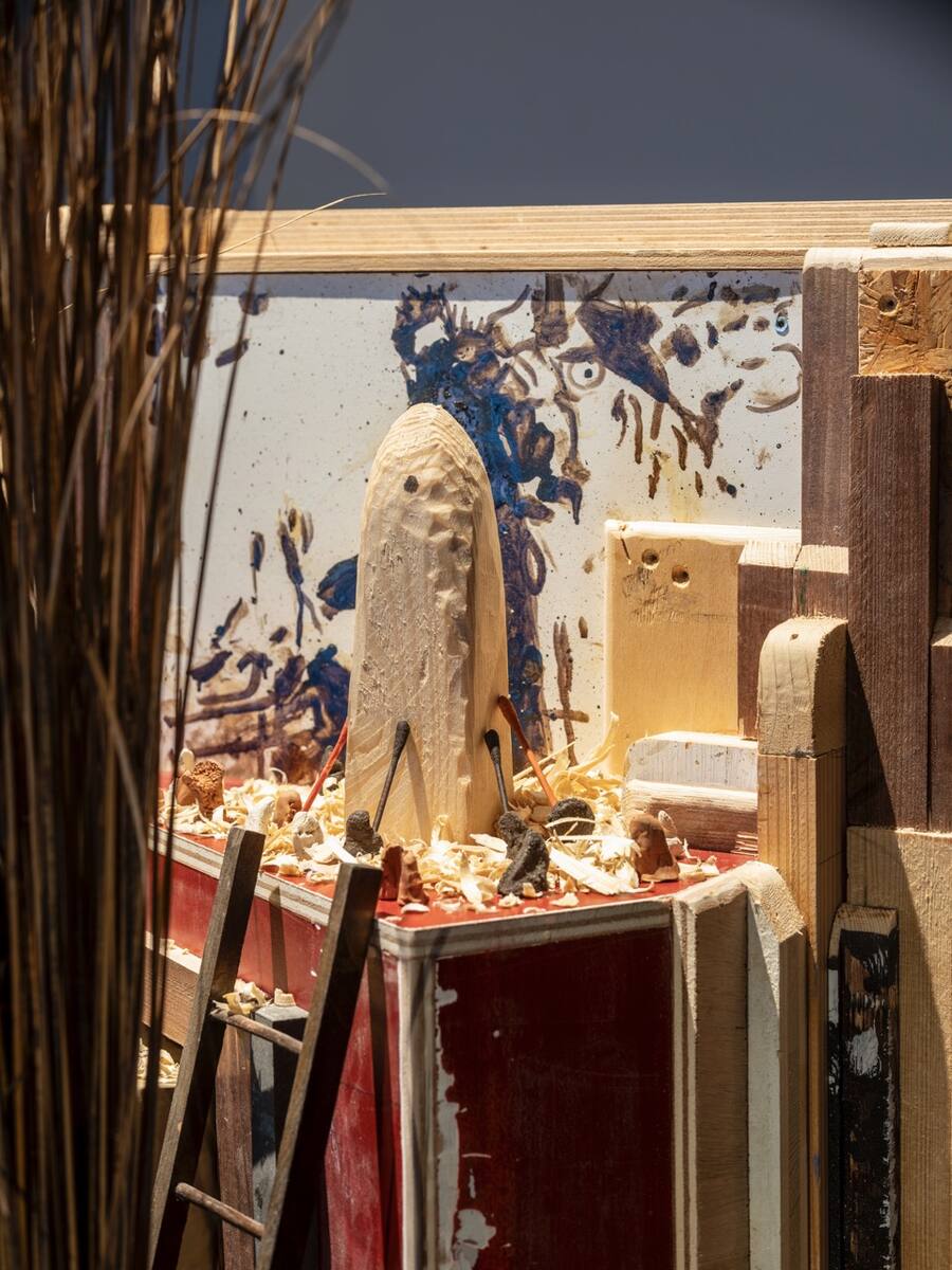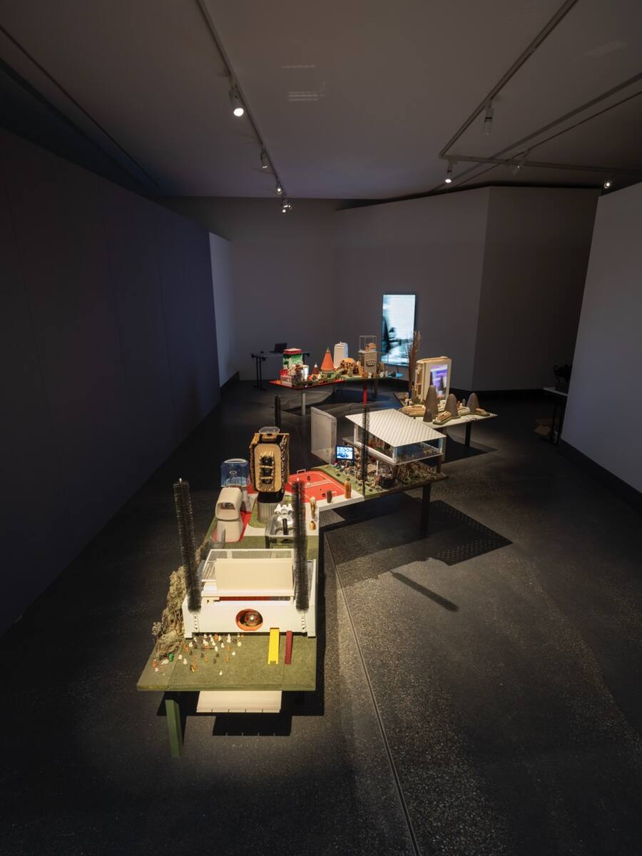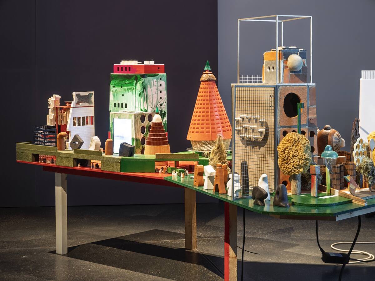 Zurich-based artist duo Andres Lutz (born 1968 in Wettingen, Switzerland) and Anders Guggisberg (born 1966 in Bienne, Switzerland) have been enriching the art world for almost thirty years with their exuberant installations. Drawing from an ever-growing pool of used, everyday and archaic materials, they transform these components in an almost alchemical process into sculptural and model-like worlds. Humour and philosophical depth are inseparable in their work. Schollen aus der Vogelschau consists of several miniature landscapes positioned at knee height, inviting inspection from above. A 1950s heating unit is transformed into a modernist church tower, a gutted kitchen fan into a futuristic pavilion, and the thatched roof of a birdhouse into a piece of monumental architecture. Wooden beads, sponges and dried moss are combined with aerial photography and video footage from the Halle district to simulate industrial sites, urban landscapes and dystopian wastelands. In these unexpected juxtapositions of discarded materials, we see poetic potential and the understated appeal of ecological sustainability unfold.