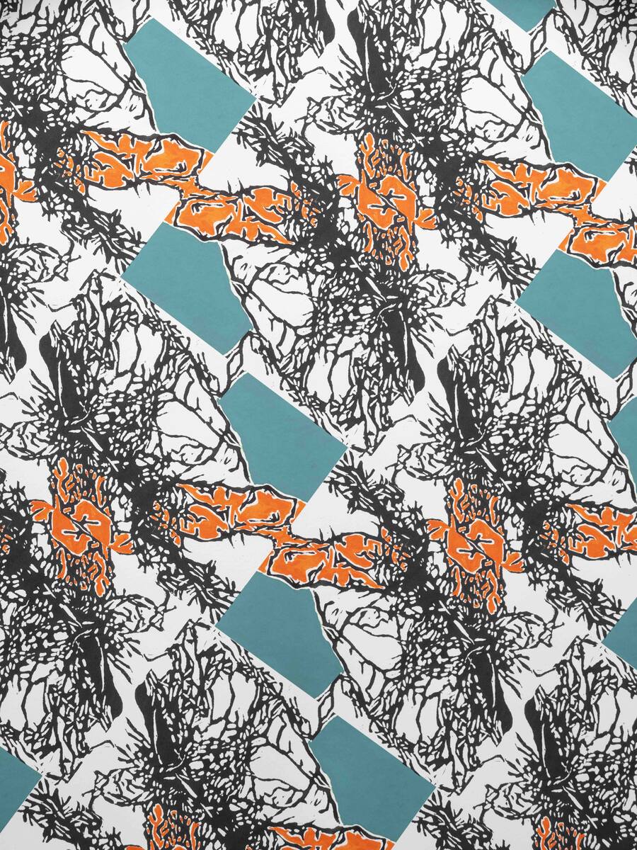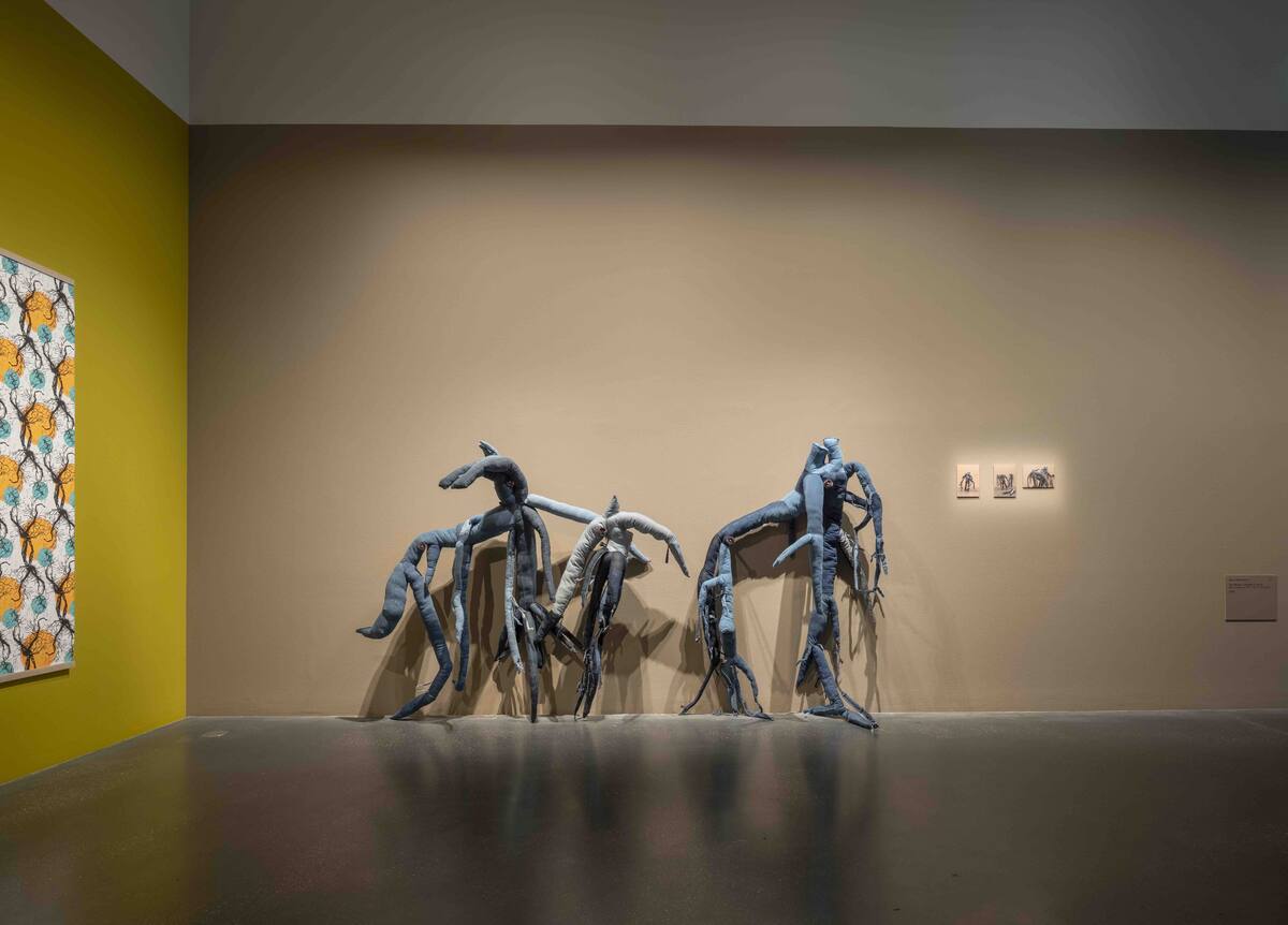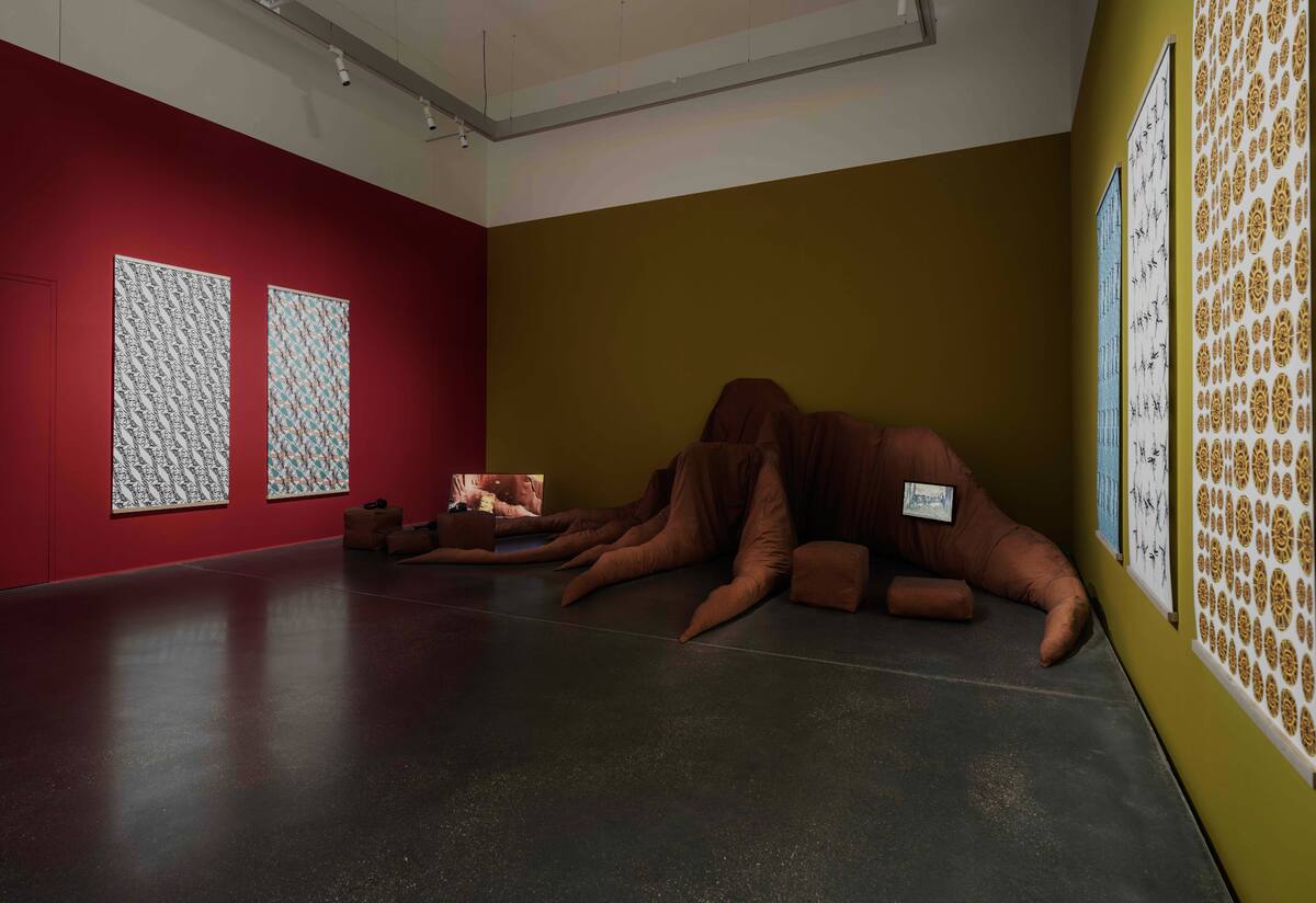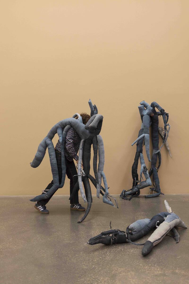 Life in the soil is hugely diverse – and essential to life above it. At the centre of both realms are plants. Like pumps, they drive the exchange of matter between ecosystems. They connect the teeming mass of small and microscopic organisms below with the larger, more familiar life above. What might they tell us – if only we could understand them? Geneva-based artist Mabe Bethônico (born 1966 in Belo Horizonte, Brazil) gives symbolic form to roots in her sewn fabric sculptures, which resemble dolls and appear to have emerged above ground to engage with the world. The multilayered patterns on her large-format prints reflect fundamental subterranean processes of exchange, and are based on linocuts that the artist made from plant samples she cultivated herself. Videos made in collaboration with students from Geneva University of Art and Design and the Berlin-based puppet theatre Das Helmi playfully stage the lives and motivations of the soil’s protagonists.
