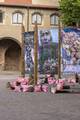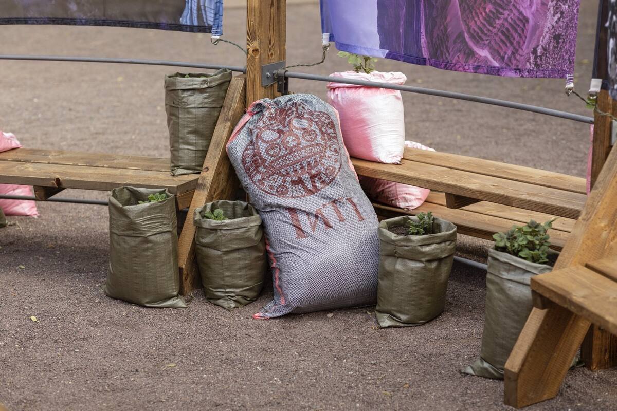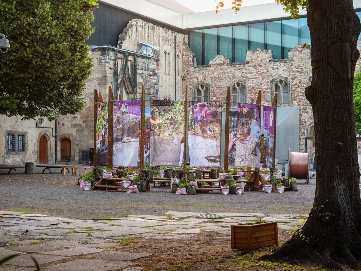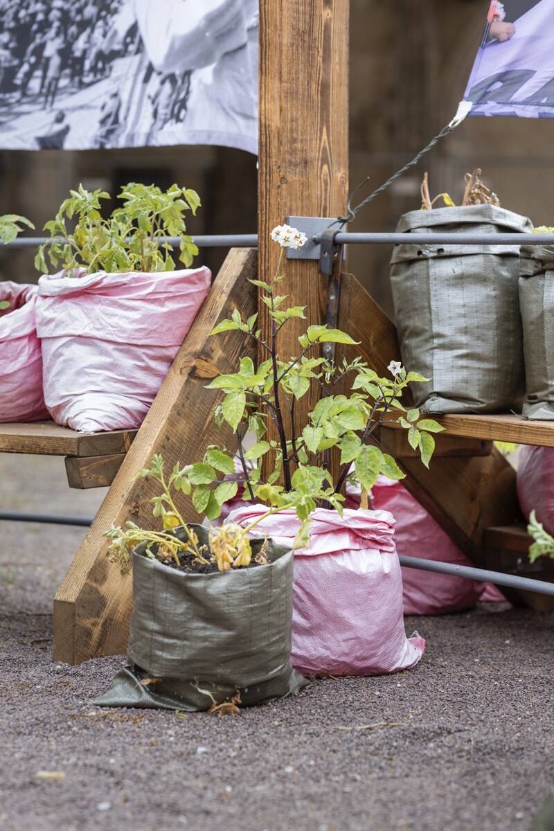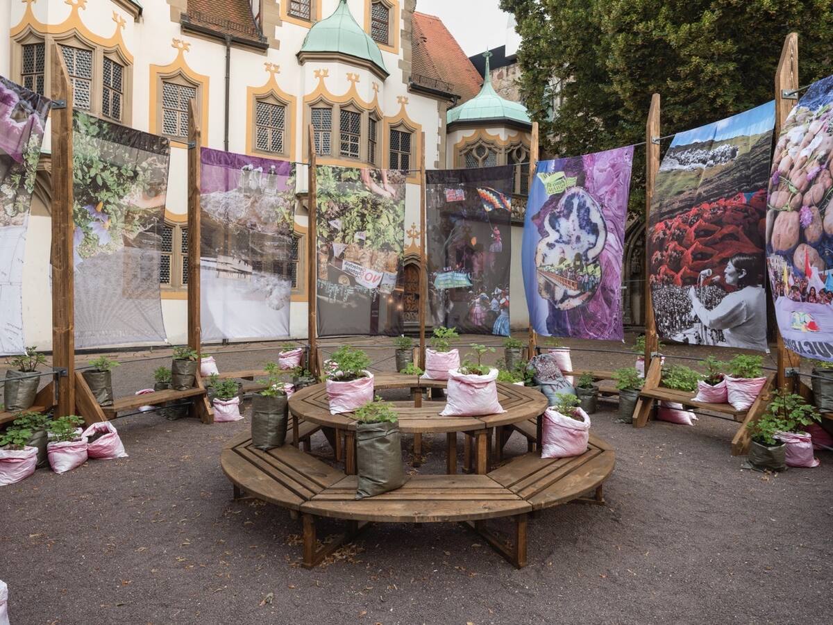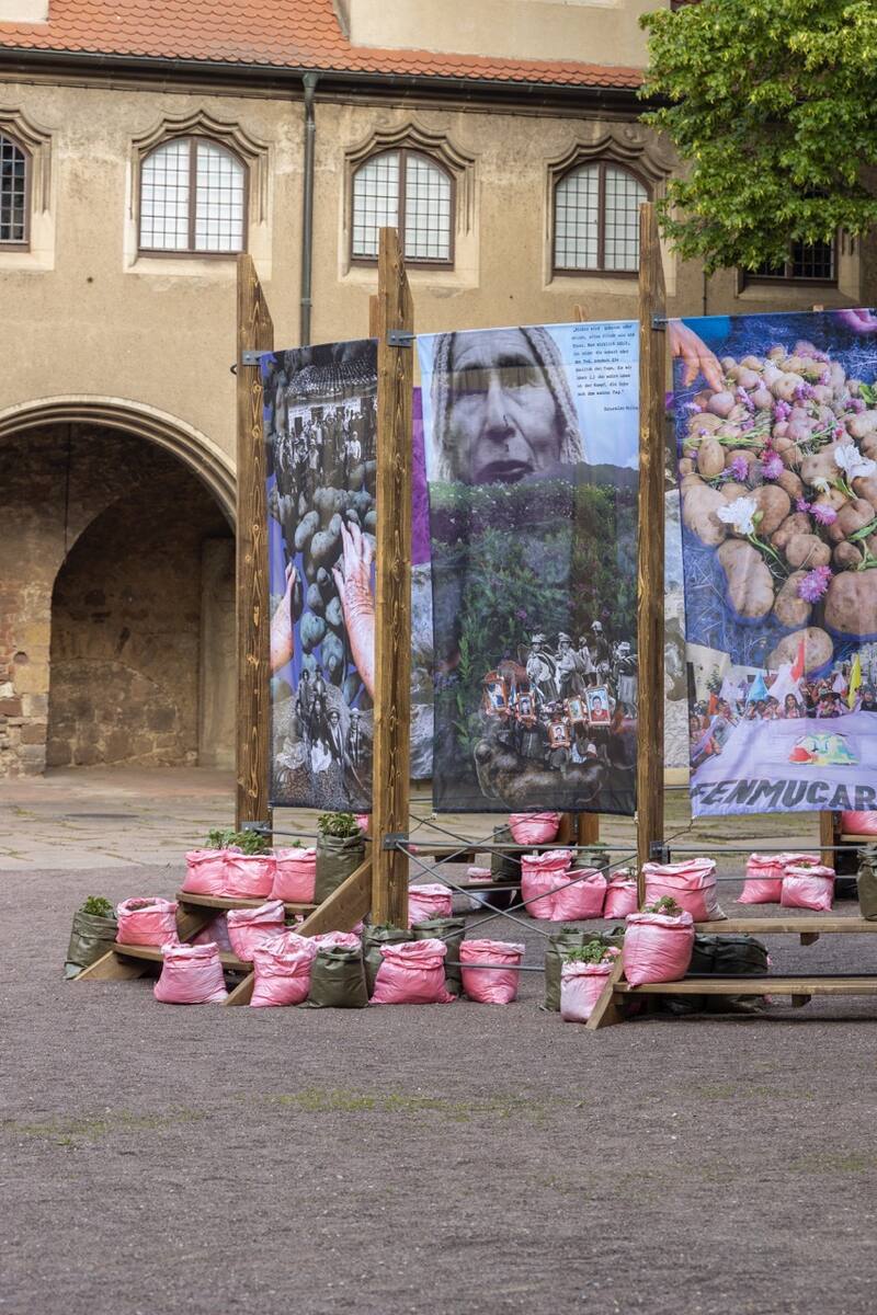 Für die Quechua-Künstlerin und Kunstwissenschaftlerin Daniela Zambrano Almidón (geb. 1993 in Lima, Peru, lebt in Berlin) und die Künstlerin Åsa Sonjasdotter (geb. 1966 in Helsingborg, Schweden, lebt in Berlin und Südschweden) bildet die Kartoffel ein kraftvolles Symbol für Migration, Fürsorge und Erdverbundenheit. Ihr laufendes kollaboratives Forschungsprojekt Papitas Taypuycha – Earthing Potatoes (Kartoffeln vererden), das erstmals auf der Singapore Biennale 2022 gezeigt wurde, ehrt die Schönheit ihres Anbaus als eine ethisch-ästhetische Praxis. Im Innenhof der Moritzburg schufen die Künstler:innen ein begehbares Monument, das Anbau und Geschichten von Papas/Potatoes/Kartoffeln kultiviert und dadurch die zentrale Andenregion von Huánuco mit Mitteldeutschland und darüber hinaus verbindet. Alte Sorten, die mit der Kolonisierung Abya Yalas (so ein indigener Name für Amerika) nach Europa kamen, wachsen an jedem Pfosten der kreisförmigen Installation. Als wären sie selbst heraldische Zeichen, tragen sie die Regenbogenfarben der Freiheitsfahne der deutschen Bäuer:innen und der indigenen Wiphala-Flagge – solcherart 500 Jahre Kampf für das Recht zum Ausdruck bringend, frei und gerecht ohne Unterdrückung Landwirtschaft zu betreiben.