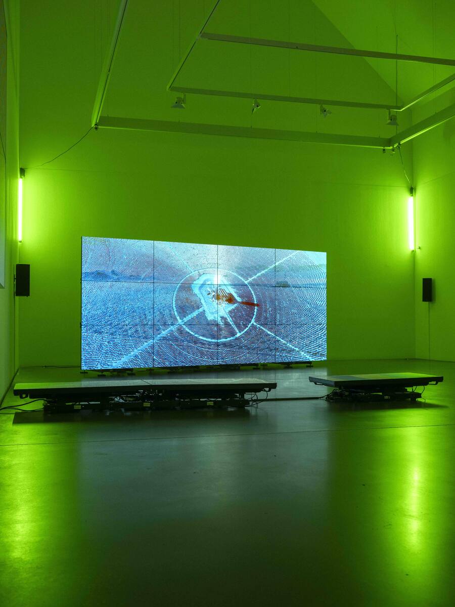 Der in Köln lebende Künstler und Filmemacher Viktor Brim (geb. 1987, Usbekistan) nimmt mit Saline Operations die Mojave-Wüste im Südwesten der USA ins Visier. Deren trockengefallene Salzseen, in deren geologischen Schichten das Klima von Millionen von Jahren ablesbar bleibt, dienen heute der Ernte von Solarsalz, einem wichtigen Speichermedium für die Photovoltaik. Wie eine extraterrestrische Landschaft wirkt das schroffe Gelände. Brim taucht es in datenbasiertes farbiges Licht mithilfe eines NDVI-Filters, der unsichtbare tektonische Strukturen, Vegetationszonen und die von Menschen geschaffenen Infrastrukturen überdeutlich sichtbar macht. Der Künstler spricht von einer „operativen Betrachtung“ der Landschaft. Auf mehrere Bildschirme im Raum verteilt, der durch geodätische Gitter wie eine Landkarte strukturiert ist, und mit einer künstlich generierten 4-Kanal-Tonspur unterlegt, betont Saline Operations die Komplexität einer Geografie, die sich durch natürliche und extraktive Prozesse unablässig verwandelt.