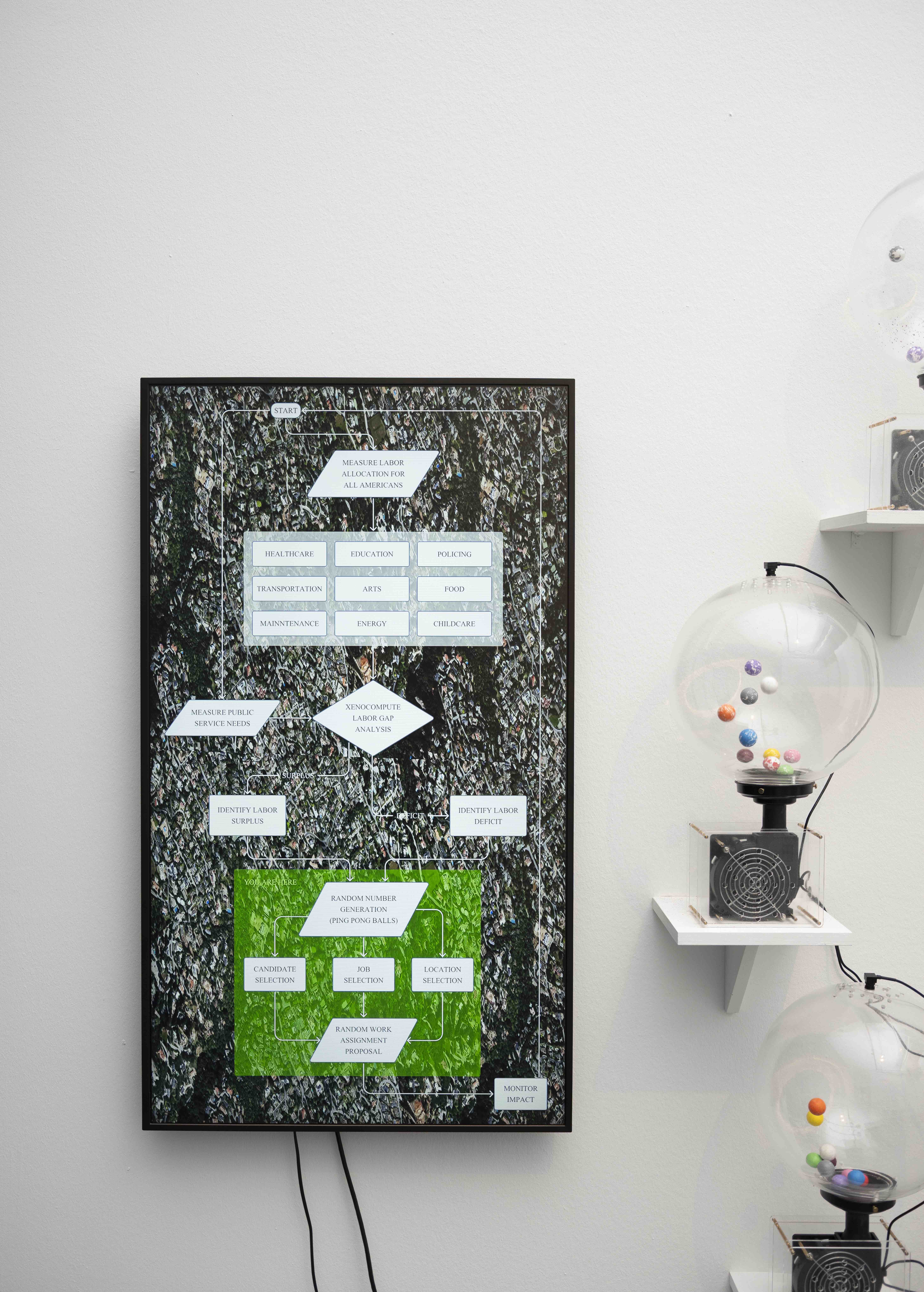 Heute vorherrschende Computertechnologien wurden unter wettbewerbs- und wachstumsorientierten Rahmenbedingungen entwickelt, die maßgeblich zu sozialer Ungleichheit und ökologischen Krisen beitragen. Was aber, so fragen die New Yorker Künstler:innen und Medienaktivist:innen Tega Brain (geb. 1982 in Sidney, Australien) und Sam Lavigne (geb. 1981 in San Francisco), wenn digitale Systeme andere ökonomische Prinzipien verfolgten? Für Planetarische Bauern greifen sie historische und fiktive Beispiele sogenannter Xenocomputing-Systeme auf, wie das 1971 in Chile für eine kybernetisch gesteuerte Planwirtschaft entwickelte Cybersyn oder das in Ursula K. Le Guins Roman The Dispossessed entworfene DivLab zur Organisation einer öko-anarchistischen Gesellschaft. Brain und Lavigne entwickelten einen Computer, der neue Arbeitsverteilungen für die US-amerikanische Bevölkerung vorschlägt – basierend auf realen Namen und Berufsangaben aus Wählerverzeichnissen. Im Gegensatz zu sogenannten KI-Systemen, die Entscheidungen automatisieren, folgt ihr Rechner einem anderen Prinzip: dem Zufall.